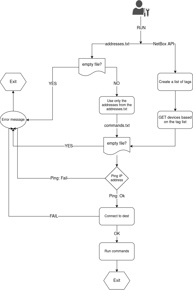 For every IP Address, we will check if the device is up and running and try to connect to it. If we successfully connect, we will push every command from the commands.txt file.