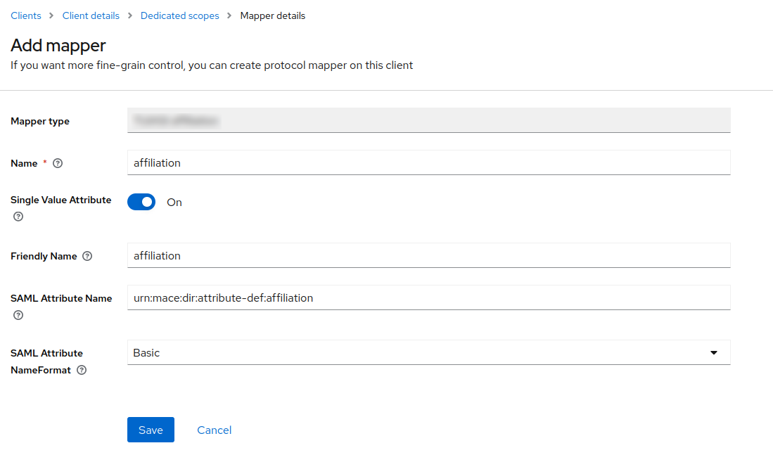 Click on Configure a new mapper and select the mapper needed. Here, I will use the mapper described above, named affiliation. A new page will be displayed to us, where we will set a name for this mapper, a friendly name, and a SAML Attribute Name, which we will use in the Shibboleth config.