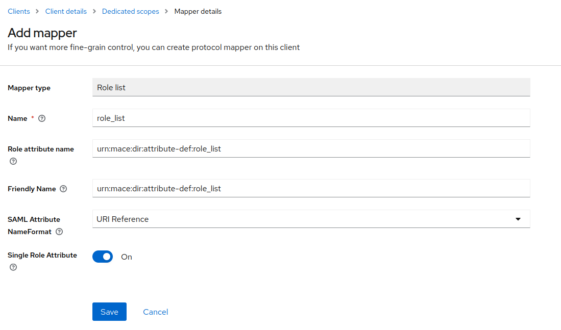 For now, we have the affiliation attribute; let’s add the attribute, which will contain a list of roles. This kind of mapper will be present in a default Keycloak installation. From Add mapper > By configuration, select Role list. Again, we will set a name, a Role attribute name, a friendly name, and SAML Attribute NameFormat. The NameFormat needs to be URI Reference. You can use whatever you want for the values, but remember that we need to use these values in the Shibboleth config. Don’t forget to turn off the Single Role Attribute.
